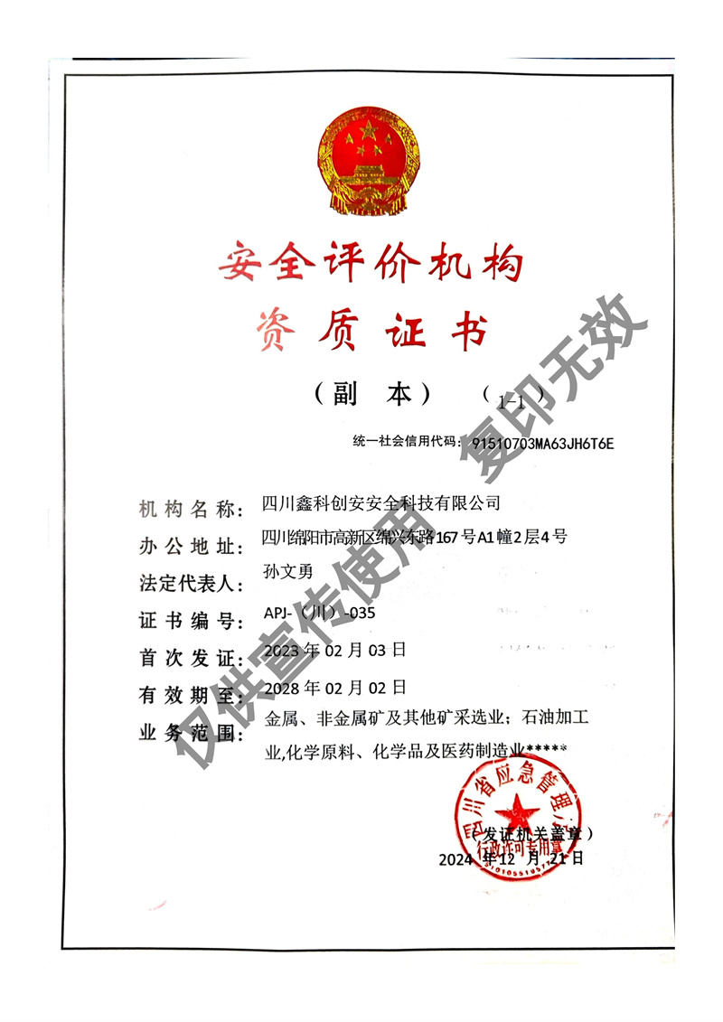四川鑫科創(chuàng)安安全科技有限公司成立于2020年,是川北地區(qū)取得資質(zhì)的民營(yíng)安全評(píng)價(jià)機(jī)構(gòu)(資質(zhì)證書編號(hào):APJ-(川)-035)。并于2022年?duì)款^成立綜合應(yīng)急救援隊(duì)伍 - 綿陽曙光應(yīng)急救援中心。